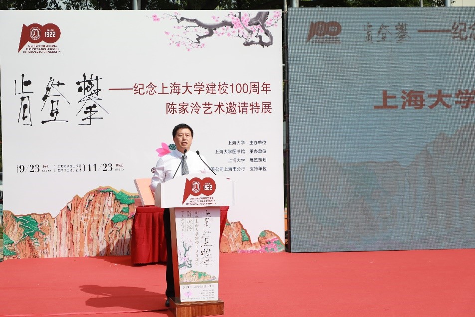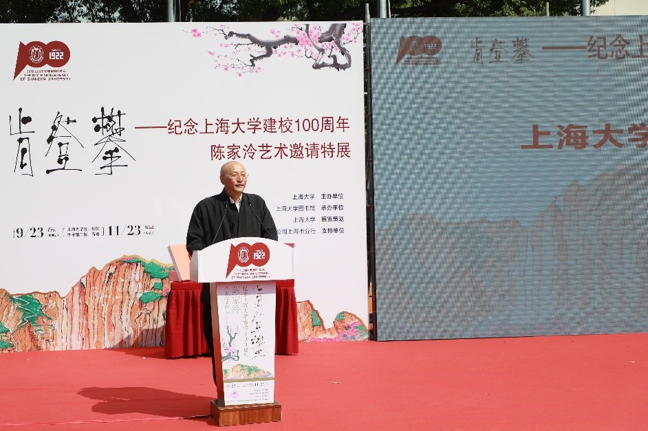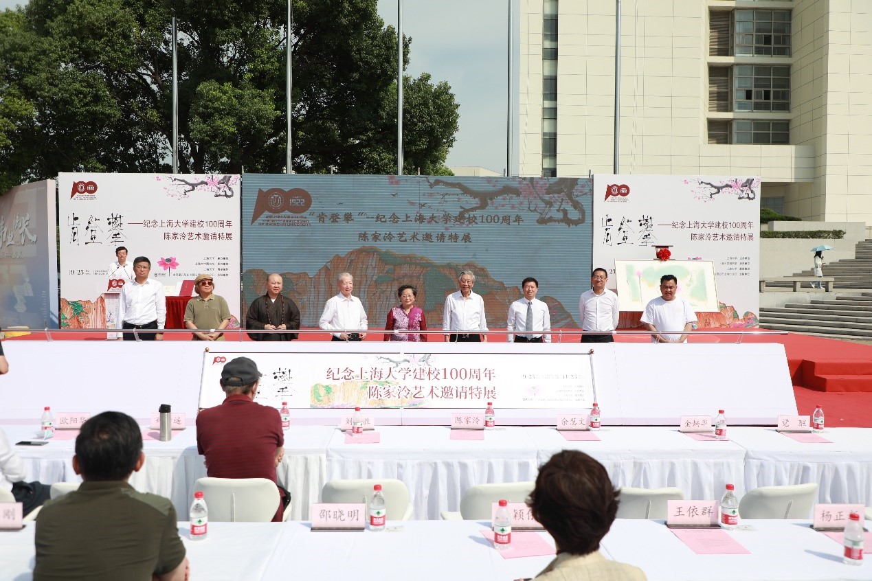 最后,陈家泠先生、余慧文女士、金炳华主席、刘昌胜校长、觉醒大和尚、陈颂清先生、郑辛遥先生、魏辉先生和杨军先生一同上台为展览揭幕。