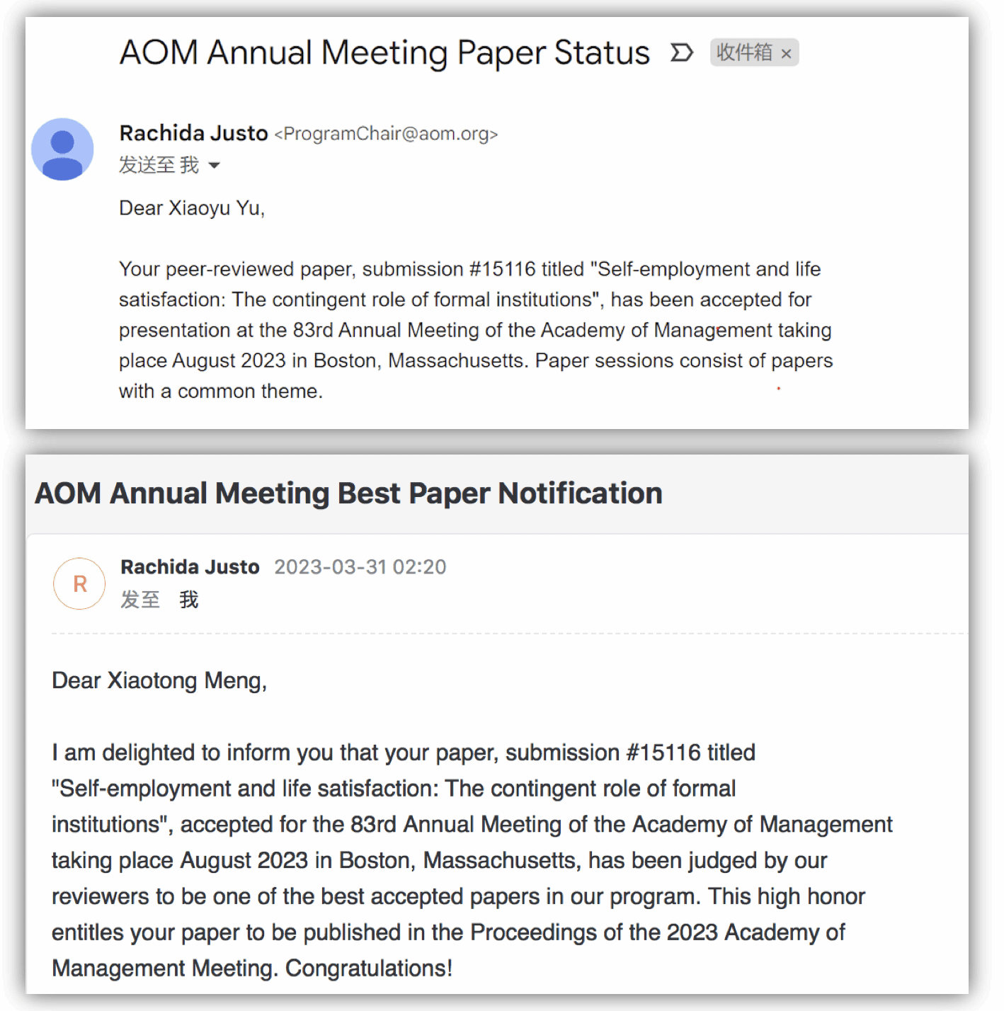美国管理学会成立于1936年,是全球管理学领域历史悠久、最负盛名的学术组织,在全球120多个国家拥有两万多会员,会刊包括《Academy of Management Review》、《Academy of Management Journal》等管理学顶级期刊。AoM会议旨在建立一个充满活力和支持性的学者社区,每年举办一次,是管理学界高水平国际学术年会之一。