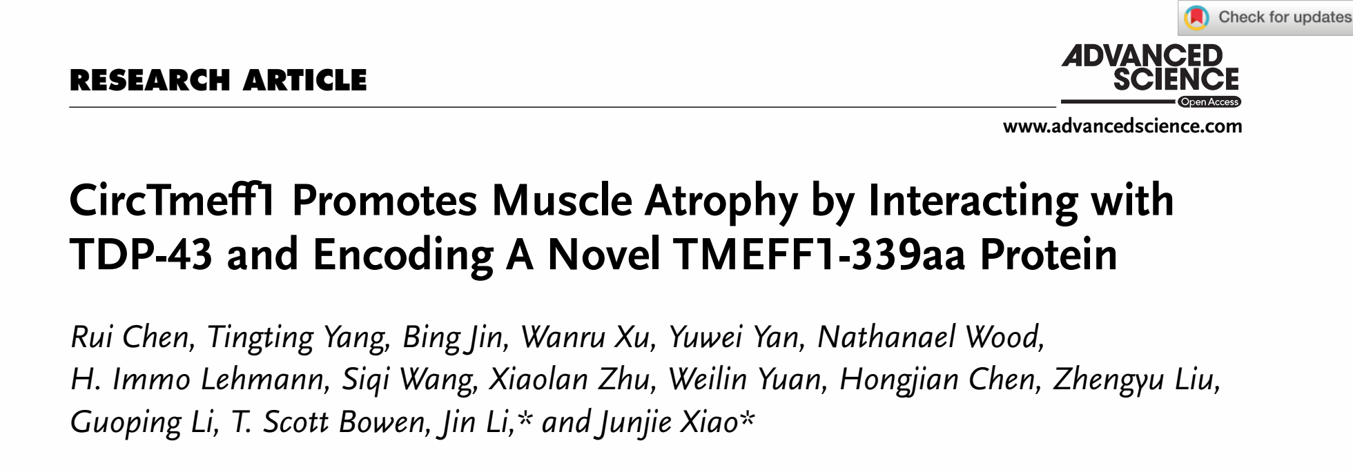 肌肉萎缩是衰老、神经损伤、心力衰竭等多种疾病的常见并发症,目前缺乏治愈的方法。环状RNA(circRNAs)是一类新的非编码RNA,由于具有高稳定性等特殊的分子特性,导致其在多种疾病发挥着重要作用。然而,它们在肌肉萎缩中的作用和潜在机制仍不完全清楚。该研究通过测序筛选发现,环状RNAcircTmeff1在多种类型的动物水平肌肉萎缩模型(心力衰竭、切神经、固定诱导的肌肉萎缩模型)和多种细胞水平的肌肉萎缩模型(血管紧张素II、地塞米松和肿瘤坏死因子刺激诱导的肌肉萎缩模型)中表达一致性升高。提高circTmeff1可以诱发肌肉萎缩的发生,而抑制circTmeff1则可以缓解多种肌肉萎缩的发生,甚至可以治疗已经发生的肌肉萎缩。CircTmeff1一方面可以结合TDP43蛋白诱发线粒体损伤释放线粒体DNA,进一步激活cGAS/STING信号通路;另一方面circTmeff1可以通过滚环翻译产生一个全新的蛋白质,共同介导肌肉萎缩的发生。该研究解析了肌肉萎缩发生是的环状RNA基础,为肌肉萎缩的治疗提供了全新的治疗靶点。