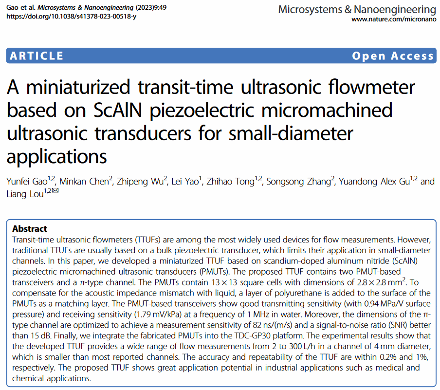 基于ScAlN压电微机械超声换能器的小型时差超声波流量计,适用于小直径应用