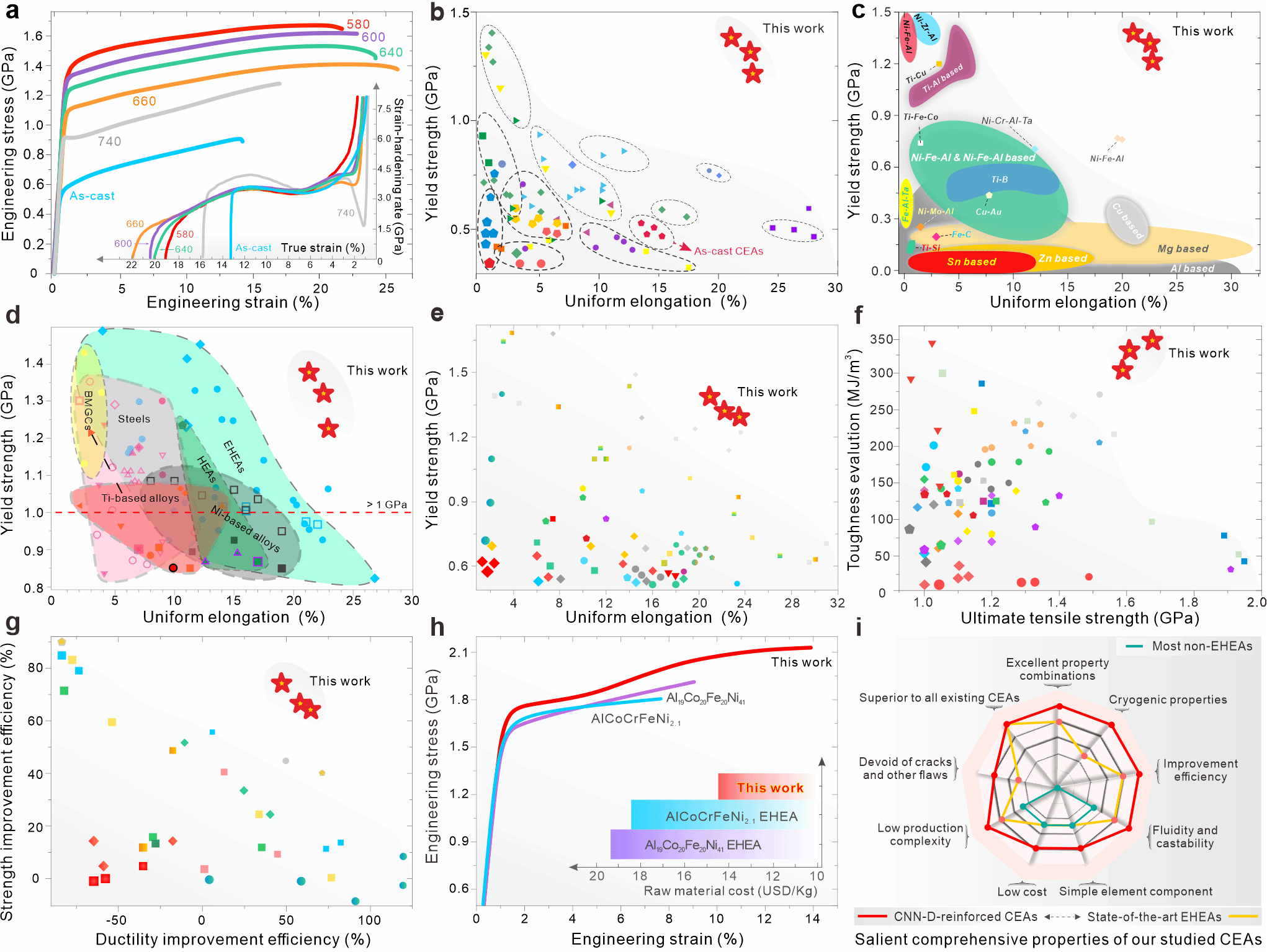 在该研究中,以公斤级的Ni-32.88wt%Fe-9.53wt%Al CEA为研究对象,通过流动性试验发现,相比于EHEAs,CEA不仅在流动性和铸造性方面表现出显著的优越性,还具有良好的可操作性和经济性。另一方面,CEA中,由纳米析出相钉扎位错组成的纳米级位错网在拉伸变形过程中同时实现了持续的应变硬化及损伤抑制效果。与传统的TWIP和TRIP效应不同的是,这种强化策略在FCC/B2共晶层片中同样表现出色。这是因为,分布在FCC相的大量CNN-D纳米结构诱导了平面滑移,并通过界面传递到脆硬的B2相,由此产生的滑移带细化和位错密度的动态积累显著提高了应变硬化能力并维持了稳定的流变应力(图2)。因此,这种易于铸造的简单共晶合金展现出令人惊讶的高强度和高延展性组合,其综合性能不仅优于所有的传统共晶及近共晶合金,还超越了目前性能最好的共晶高熵合金。值得一提的是,这种新型的CNN-D纳米结构在其它合金体系中同样表现出广泛的适用性,特别是在近期陆续发现的含有铸态纳米析出物的成分复杂(共晶)合金中。文章补充材料中列举了不同合金的实例,进一步证明了CNN-D纳米结构的普适性,表明蚕茧状纳米位错网结构是提升金属合金性能的又一重要微观组织结构。