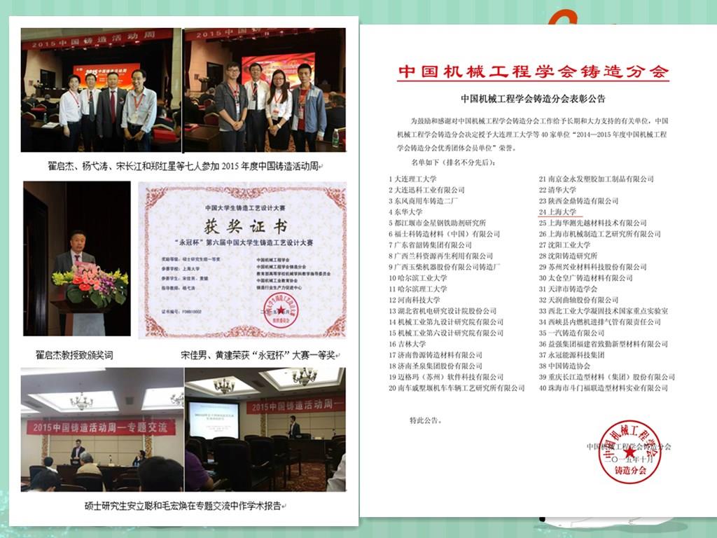 我校材料学院教授、先进凝固技术中心主任翟启杰教授参加了同期举行的中国铸造学会理事长会,并与杨弋涛教授共同参加了理事会。杨弋涛教授指导的研究生宋佳男、黄建接受了中国机械工程学会等单位授予的全国第六届“永冠杯”中国大学生铸造工艺设计大赛研究生组一等奖奖牌和奖状,硕士研究生安立聪和毛宏焕分别在分会场专题交流中作学术报告。
