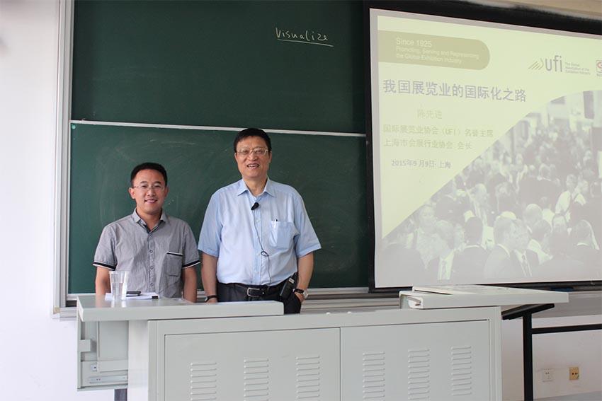 在师生互动环节,陈会长就牛盼强老师提出的关于一带一路战略中会展业的发展契机问题给出了精彩回答,他认为一带一路战略实施过程中,展览业因资源、能力等诸优势,能够而且应该成为国家战略实践中一个良性的发展平台。最后,讲座在牛老师对陈会长的高度评价声以及全场同学的热烈掌声中结束。