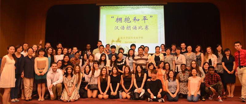 比赛开始前,国际交流学院党总支书记王海燕致辞。王老师在致辞中充分表达了对本次活动的良好祝愿,并特别指出举办朗诵大赛的目的不仅是为了提高留学生的汉语能力、丰富留学生的课外文化生活,更是为了纪念世界反法西斯战争胜利70周年,让和平永留人间。