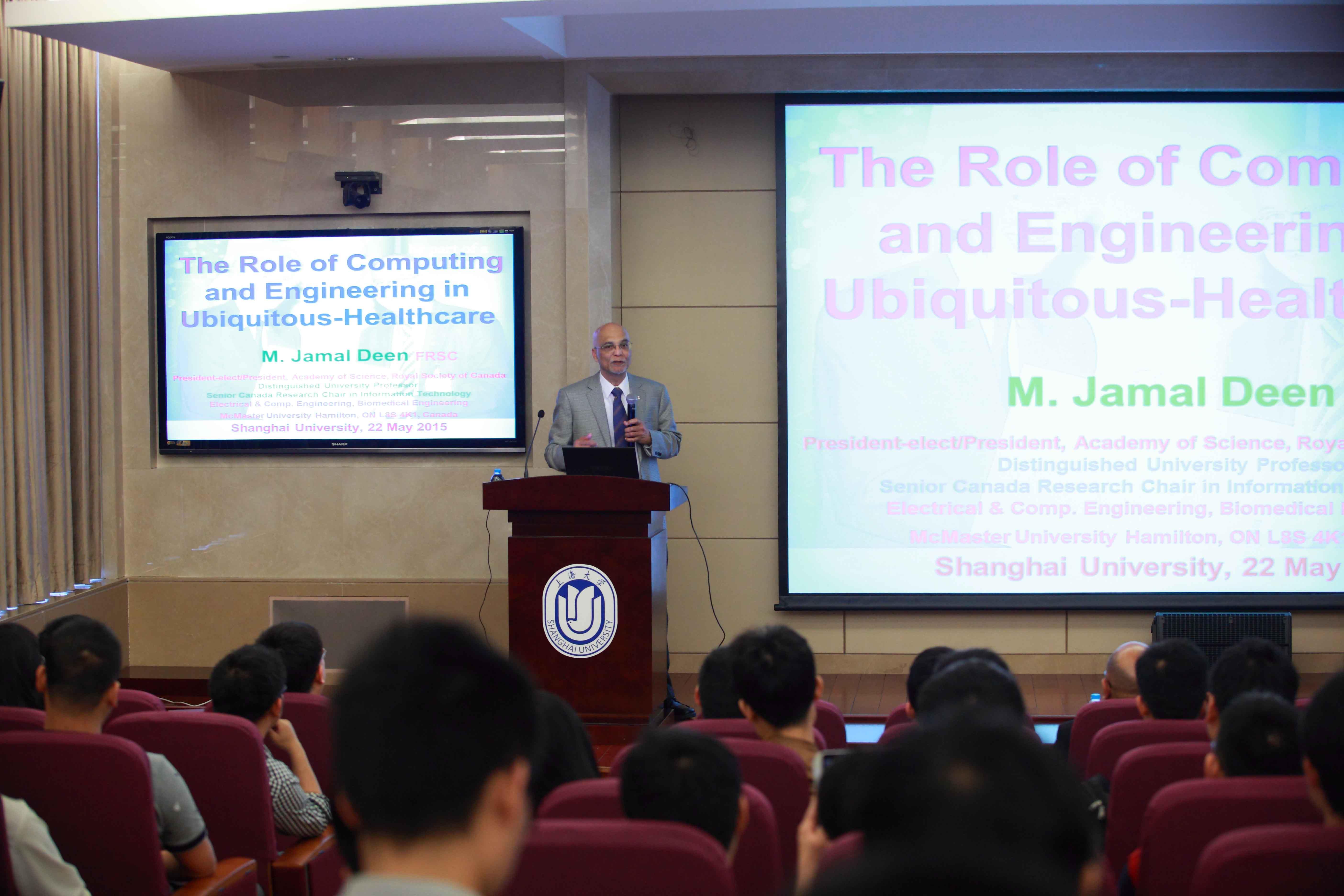 倪兰副处长首先向Jamal院士表示欢迎,并简要介绍了Jamal院士的经历。之后Jamal院士介绍了加拿大麦克马斯特大学正在研究中的项目:无处不在的健康关怀(U-Health)作为应用科学和技术手段来造福人类,特别是老年人。该项目的研究目的是希望年长者能尽可能地生活在一个独立健康的生活环境中,在他们自己家中以一种悄然无缝的方式得到有效的远程监控和帮助。Jamal院士首先以图文并茂的形式介绍了U-Health项目的背景,接着介绍了POSTECH Smart Medical Home项目,基于年龄的走路模式分析器,Auora智能膝盖,睡眠质量监控系统等研究项目,详细介绍了这些项目研究目标和研究过程中遇到的各种挑战。