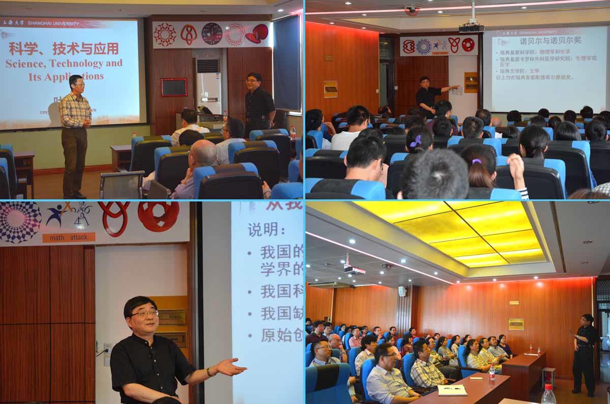 叶志明教授从诺贝尔与诺贝尔奖谈起,强调了基础研究的重要性;用图示详细展开了科学、技术及应用三者之间的关系,指出由科学家兴趣驱动开展科学研究是技术创新的源头,科学、技术和应用的发展取决于不同的学术环境和外部条件,“科学”引领着“技术”与“应用”的发展,离开了“科学”,“技术”与“应用”便无从谈起。他以涉及博弈论、概率论等理论的“石头剪子布研究”、石头扔进河里打水漂的游戏以及现场纸片翻滚落地轨迹等研究课题为例,向在座师生诠释了伟大的科学研究往往就源于随处可见的自然现象,基础研究需要潜心钻研,而不是一味的盯着应用以及短期价值,目光要长远,思维要多样化。