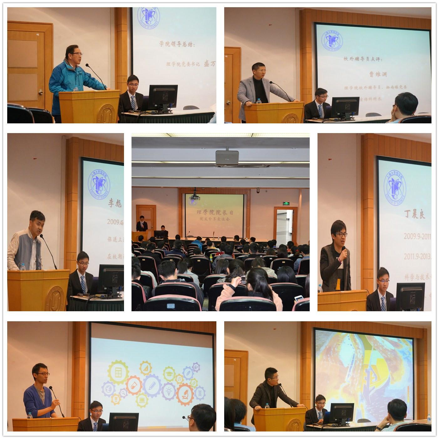 2015年3月22日下午, 理学院第十期“院长日”校友分享会专场在新校区J楼103召开。本次“院长日”活动的主题为“聆听校友故事,感悟自己人生”。理学院党委书记盛万成,理学院校外辅导员、淞南镇党委委员、宣传科长曹维渊,副院长陈玺,党委副书记刘亮参加了院长日活动。部分优秀校友代表也应邀在台下就座。