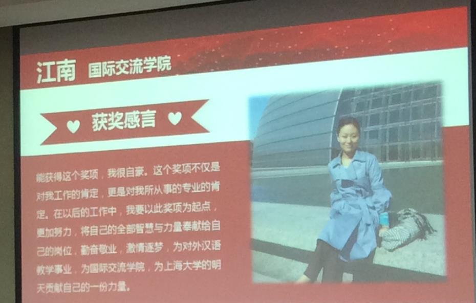 自2011年进入我院工作以来,江南主动承担了繁重的教学任务,以学生为主体进行教学,取得了良好的教学效果;并于2013年6月获得了我校“汉语国际教育”专业硕士生导师资格。在繁重的教学任务之余,江南老师仍不忘坚持关注学科的前沿理论和最新科研成果,阅读专业书籍和期刊文章,力争将教学与科研相结合。工作三年多来,她取得了良好的科研成果,主持和参与各类科研项目5项、发表论文2篇、参编教材2部、参与撰写文集1部、参加学术会议并宣读论文2次。2014年6月,她主持的课题《赵元任汉语作为外语教学学术思想研究》获国家社科基金青年项目立项。江南老师此次荣获蔡冠深优秀青年教师奖,为学院赢得了荣誉,鼓舞了士气,表明我院教师在繁重的教学任务下仍然能够做科研,并且能够做好科研。
