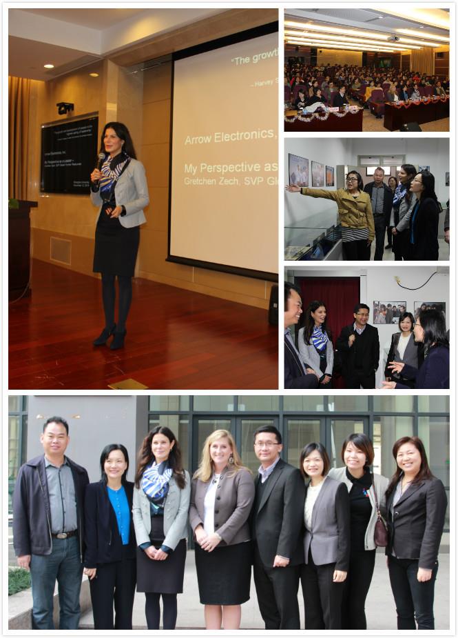 2014年11月12日,艾睿电子全球人力资源部,负责艾睿电子在全球范围内的人力资源战略规划与运营管理,同时也是公司执行委员会成员之一高级副总裁Gretchen K.Zech女士、艾睿电子亚太公司人力资源总监周燕媚女士、艾睿电子上海公司人事经理岑盈女士等一行到访通信学院,在学院党委书记黄素娟教授,副院长彭章友教授的陪同下,Gretchen K.Zech女士等人参观了翔英大楼实验室,学生竞赛作品展示厅。随后Gretchen K.Zech女士在乐乎新楼学海厅为通信学院学生做了一场关于职业生涯规划的讲座。