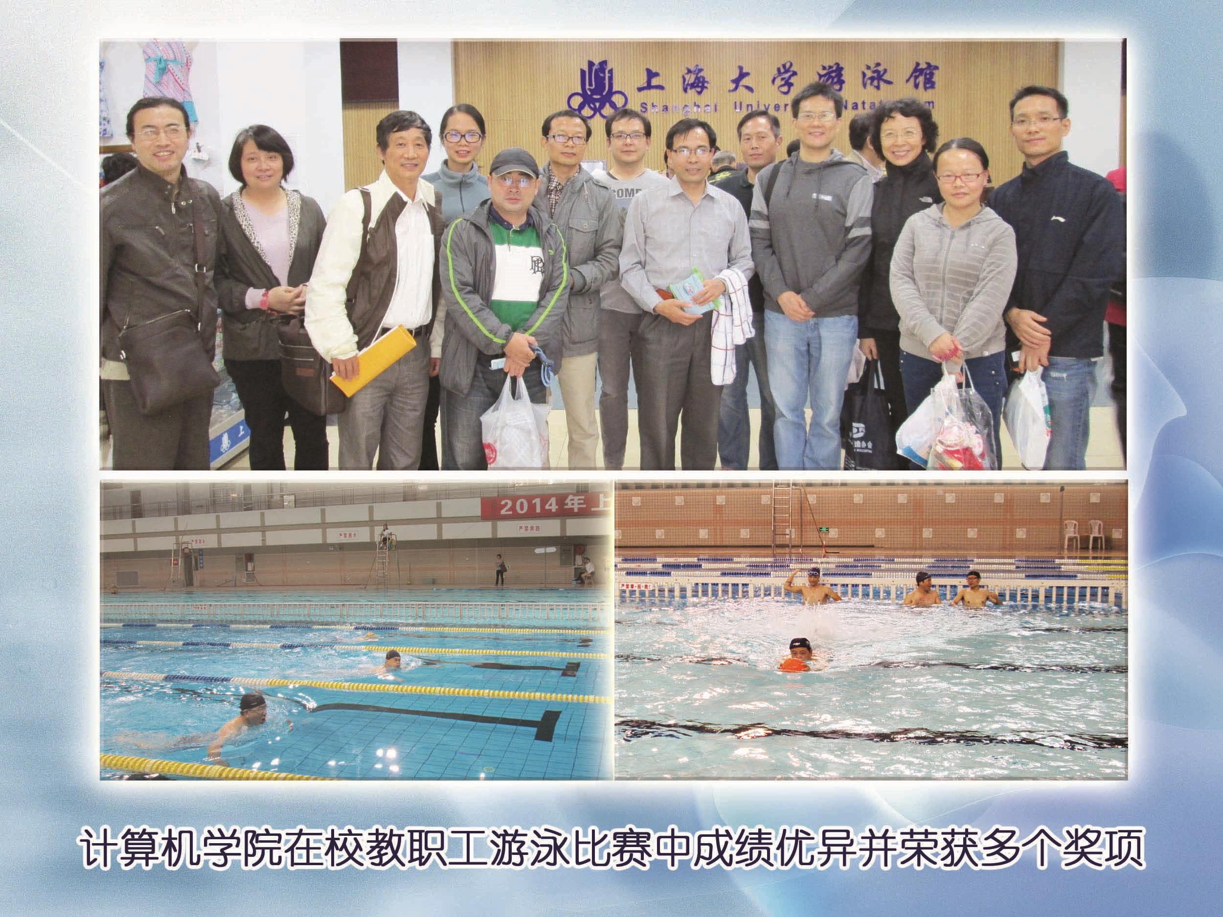 我院教工派出男队11 名,女队 4名,共计 15名游泳选手组成游泳队参赛。比赛中,运动员们热情投入,不畏艰难,力争上游。欧阳山和王旻超两位老师,虽然在比赛中出现了突发性脚抽筋等困难,然而他们还是能顽强努力,不弃不馁地坚持完成了多项团体和个人比赛任务。吴悦教授,尽管按年龄分组处于不利,但在与同组年龄占优的教师一起在泳池竞技中还是获得了第四名的好成绩。最后,在大家齐心协力奋勇拼搏之下,我院获得了骄人的战绩。在三个团体项目中,我们分别获得第一、第二和第五;个人项目中,我院的吴悦教授和方昱春老师在女子项目中分别获得第四和第五名的佳绩,宋波老师在男子50米蛙泳比赛中获得第八名。本次赛事的成绩将计入下届校运动会各参赛单位的总分,所以学院游泳队创下的优异成绩为学院在校运动会的总分奠定了基础。