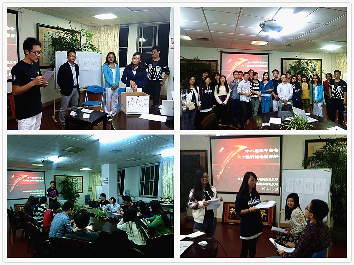 十八届四中全会刚刚落下帷幕,为学习宣传十八届四中全会精神,重温党的治国理政思想,号召大学生了解新形势、新挑战、新任务下社会主义国家法治期许及落实方略,2014年10月24日晚6点30分,社科学院本科生党支部和2013级硕士研究生党支部联合开展以“从生活中学法、知法、守法”为主题的支部生活会。此次支部活动采取“演”“讲”结合的新形式,充分调动每一位支部成员的积极性,以“小组”为单位,主动挖掘生活中与大家休戚相关的法治案例。活动由13级硕士研究生党支部宣传委员李新成主持。