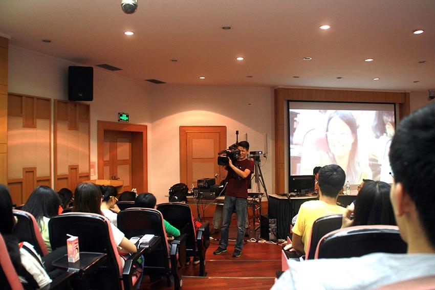 接下来,题为“电视节目制作的那些事”的演讲正式开始,主讲人是影视学院影工系2004届学长、现任转播部副科长的袁跃老师。他骄傲地告诉同学们,其实今天到场的他的同事们,大部分是影工系的学生,包括00届、04届、07届、12届,以及今年刚毕业的14届等。听闻此言,同学们不禁用热烈的掌声表达了对众多学长的欢迎。