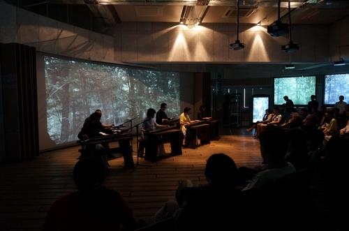 当天的表演由著名古琴家戴晓莲教授率队,参与演奏的十余名人员包括来自上海的专业古琴演奏者和业余古琴爱好者,呈献给大家九首经典曲目,令在场的观众大饱耳福。本次活动由美术学院国画系联系并协办,以期望通过引进多品类的艺术形式,为艺术类学生开拓视野和创作思路。伴随古琴演奏,现场的环形屏幕上播放当代艺术家李消非的视频作品《流水线-第22号》,再结合专业的灯光设计,营造出贴合古琴崇尚内在和寓意含蓄的演奏氛围,古典艺术与当代艺术作品的的完美结合让整个演出完整而新颖。(国画系)