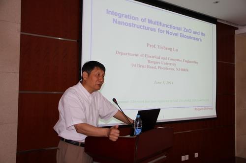 6月5日上午,卢毅成教授作了题为“Multifunctional ZnO and Its Nanostructures for Novel Biosesensors”的学术报告。卢教授详细介绍了当今ZnO领域国际研究现状及热点方向,特别是基于多功能纳米ZnO材料的生物传感器的研究,并展示了他带领的研究组在ZnO功能材料和器件方面开展的工作和取得的成果。在座的老师、同学都感到深受启发。