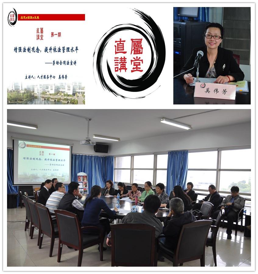 5月9日下午,以“启思、凝聚、发展”为宗旨的大众课堂——“直属讲堂”在校本部D楼直属单位教工之家成功开讲第一课:增强法制观念,提升依法管理水平——劳动合同法宣讲。直属单位党委书记陆翠兰同直属单位从事人事工作及对本报告主题感兴趣的我校教职工参加了讲座。讲座由直属单位党委副书记、工会主席黄坚主持。
