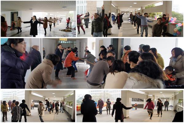 12月20日,外国语学院迎来了一年一度的趣味运动会。寒风凛冽,淡淡雾霾依旧无法阻挡大家迎接新年的喜庆热情,大约有50余位教职工在欢声笑语中度过了快乐的下午,在广播操展示、拔河、跳绳、赶球和掷飞镖各项趣味活动中锻炼了身体,增进了感情。广播操现在已成为外语学院一项有规律的活动,每周一、三下午四点钟由工会牵头,教师自发在C楼二楼空地进行锻炼。拔河一向是最热闹、参与度最高的项目,周院长亲自发号施令,双方队员齐心协力,加油鼓励声震天。最后趣味运动会在踩气球这一传统节目中成功落下帷幕,象征新年好彩头。
