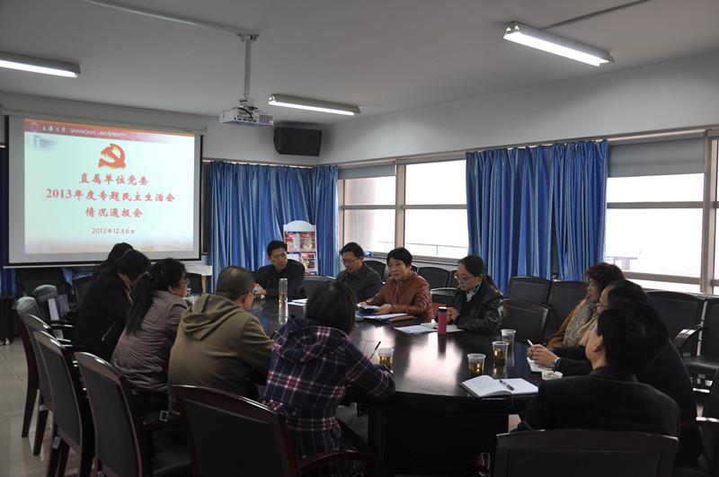 12月6日上午,直属单位党委在校本部D楼直属单位教工之家召开2013年度第八次党委(扩大)会议,通报直属单位党委党的群众路线教育实践活动专题民主生活会召开情况,讨论部署近期工作。会议由直属单位党委书记陆翠兰主持,直属单位党委委员及所属单位负责同志、直属单位学校第二次党代会党代表、党支部书记、教授代表、工青妇负责人等参加了会议。